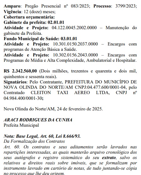Prefeita Araci dá ‘bolada’ de R$ 2,3 milhões para empresa Cleiton Táxi Aéreo em Nova Olinda do Norte