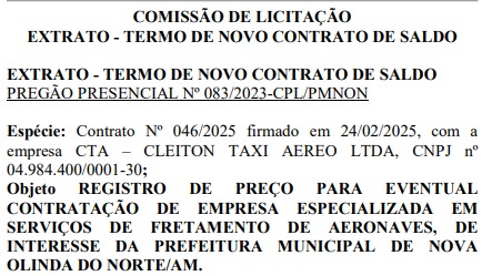 O extrato do contrato foi publicado no Diário Oficial dos Municípios do Amazonas na última terça-feira (29), embora a assinatura tenha ocorrido em 24 de fevereiro de 2025. O acordo tem vigência de 12 meses, tempo suficiente para consumir mais de R$ 195 mil por mês dos cofres públicos — uma quantia considerável, especialmente em um município do interior.