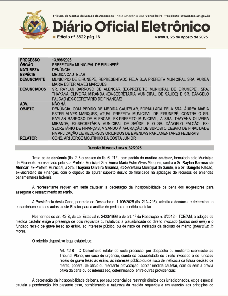 Amazonas – O Tribunal de Contas do Estado do Amazonas (TCE-AM) decidiu aceitar uma denúncia contra o ex-prefeito de Eirunepé, Raylan Alencar, sob suspeita de uso indevido de recursos federais destinados ao município.