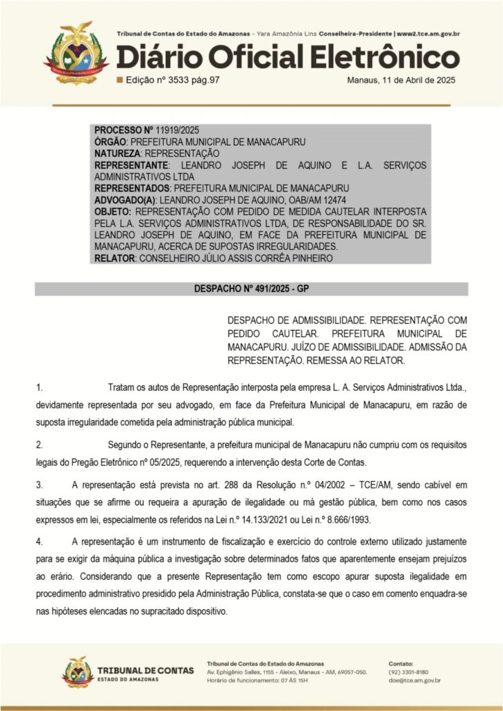 Segundo o TCE-AM, o processo licitatório apresenta indícios de falhas que podem ter gerado danos aos cofres públicos. As irregularidades serão investigadas minuciosamente pela Corte. A denúncia partiu da empresa L.A. Serviços Administrativos LTDA, representada por Leandro Joseph de Aquino.