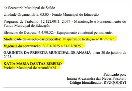A dispensa de licitação, sob o número 012/2025, foi formalizada pelo GABINETE DA PREFEITA MUNICIPAL DE ANAMÃ em 30 de janeiro de 2025, e assinada por KATIA MARIA DANTAS RIBEIRO, Prefeita Municipal de Anamã/AM. A vigência da contratação se estende de 30/01/2025 a 31/03/2025.