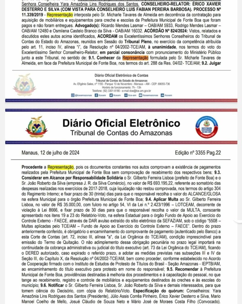 O TCE-AM multou o prefeito em R$ 35 mil, com um prazo de 30 dias para pagamento. A decisão foi tomada após uma Representação interposta por Micharle Tavares de Almeida, que evidenciou pagamentos realizados sem comprovação de recebimento dos bens. A investigação mostrou que a Prefeitura Municipal de Fonte Boa desembolsou R$ 693.195,22 sem qualquer evidência de que os materiais contratados foram entregues.