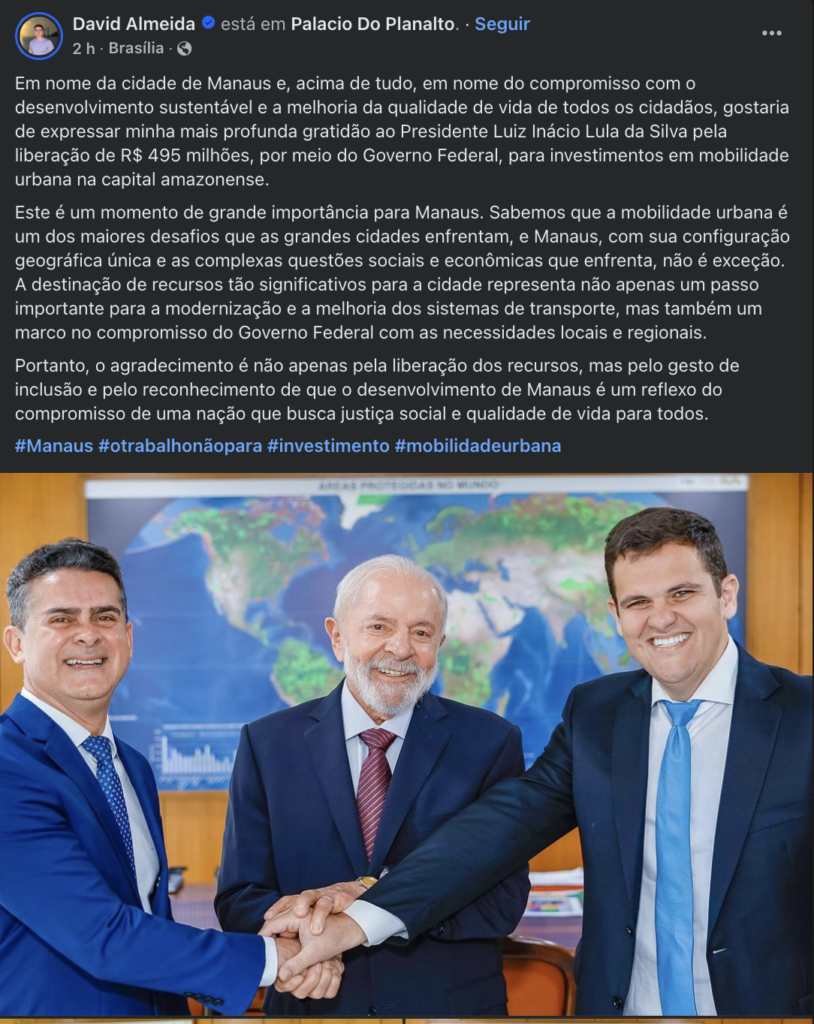 Prefeito David Almeida agradece ao presidente Lula liberação de R$ 495 milhões em recursos para Manaus