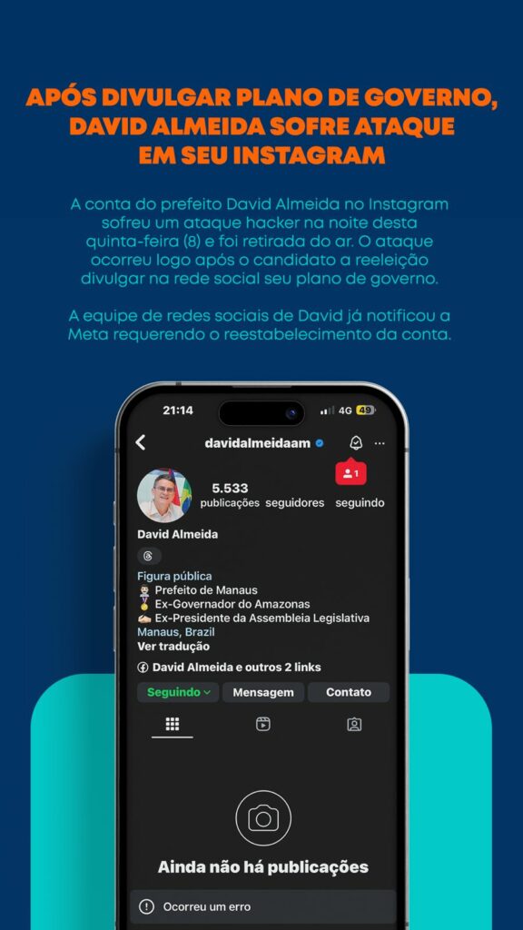 Manaus – A conta oficial do prefeito David Almeida no Instagram foi alvo de um ataque hacker na noite desta quinta-feira (8), levando à sua remoção do ar. O incidente ocorreu pouco depois de Almeida divulgar seu plano de governo para a próxima gestão, em um post que detalhava suas propostas e objetivos para a reeleição.