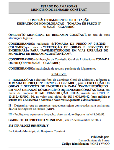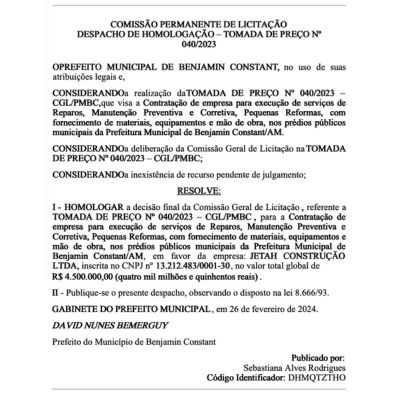 Amazonas – O prefeito de Benjamin Constant, no interior do Amazonas, David Bemerguy, assinou no último dia 26 de fevereiro de 2024, a homologação de tomada de preço nº 040/2023 para contratar a empresa JETAH CONSTRUÇÃO LTDA, inscrita no CNPJ n° 13.212.483/0001-30, pela bagatela de R$ 4.500.000,00.