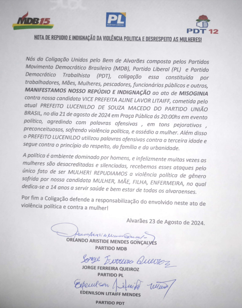 A acusação foi feita pela Coligação Unidos pelo Bem de Alvarães, que é composta pelos partidos Movimento Democrático Brasileiro (MDB), Partido Liberal (PL) e Partido Democrático Trabalhista (PDT). A coligação expressou sua profunda indignação após os comentários do prefeito supostamente dirigidos à candidata a vice-prefeita, Aline Lavor Litaiff.
