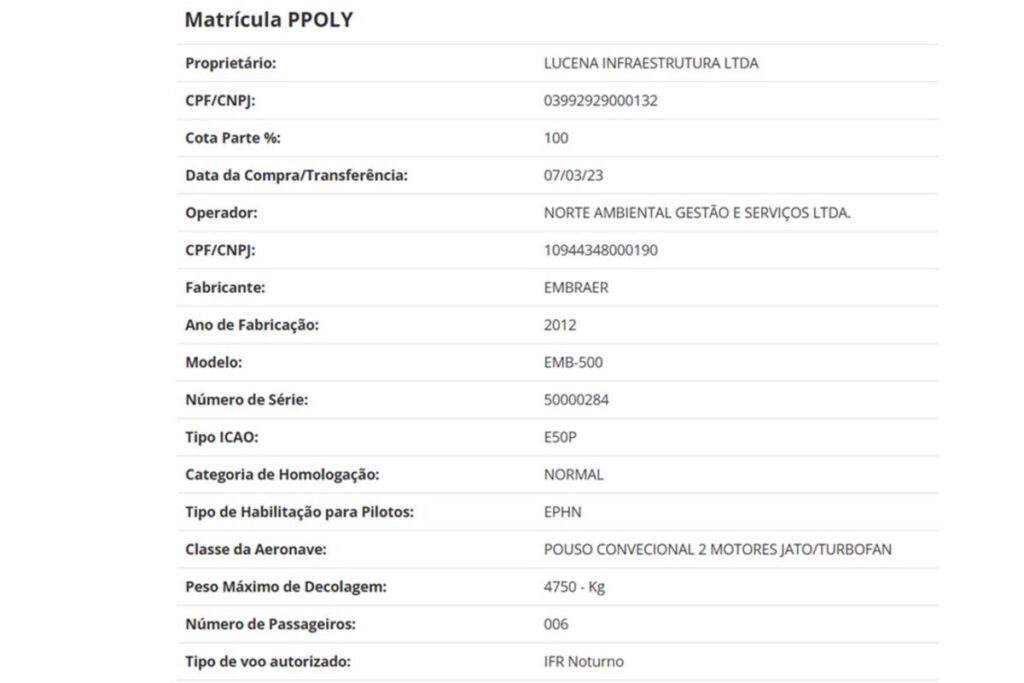 De acordo com informações da Agência Nacional de Aviação Civil (Anac), o jato é propriedade da empresa Lucena Infraestrutura Ltda e é operado pela Norte Ambiental Gestão e Serviços Ltda.
