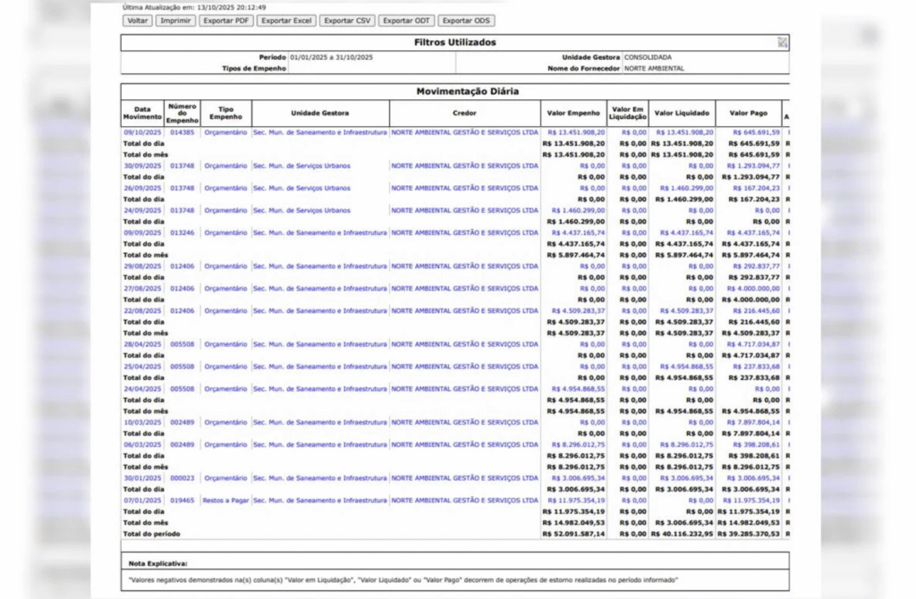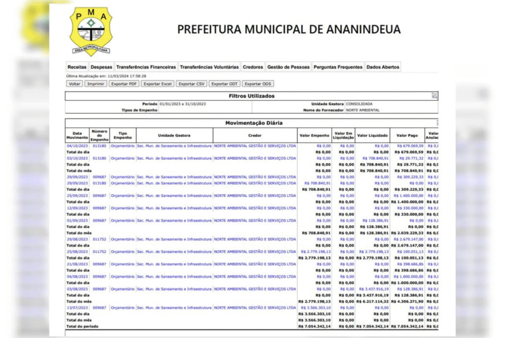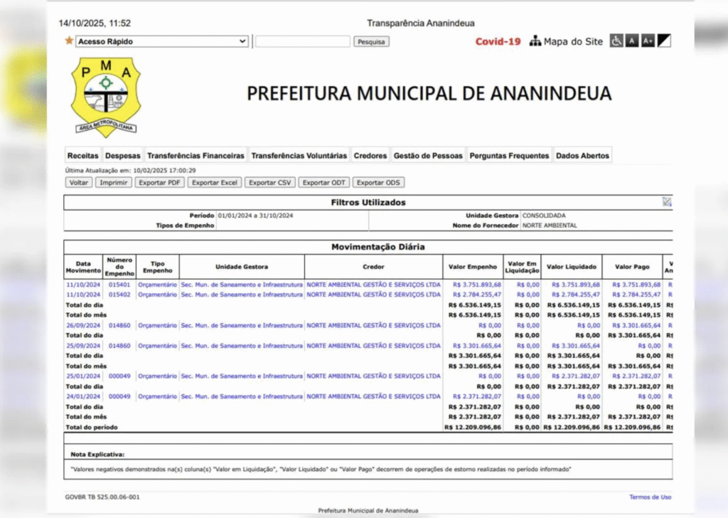 A Norte Ambiental recebeu R$ 58,5 milhões da Prefeitura de Ananindeua nos últimos três anos. Os pagamentos cresceram vertiginosamente. Em 2023, a empresa recebeu R$ 7 milhões. No ano seguinte, o repasse foi de R$ 12,2 milhões. Em 2025, até o momento, o município pagou R$ 39,3 milhões à Norte Ambiental, de acordo com o Portal da Transparência do município paraense.