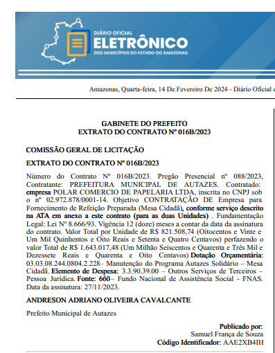 Amazonas – O prefeito de Autazes, Andreson Cavalcante, de Autazes, está novamente envolvido em escândalo de desperdício de verba pública, após um contrato de valor exorbitante vir a tona. A administração municipal assinou um contrato no de R$ 1.643.017,48 com a Polar Comércio de Papelaria LTDA, conforme exposto recentemente.