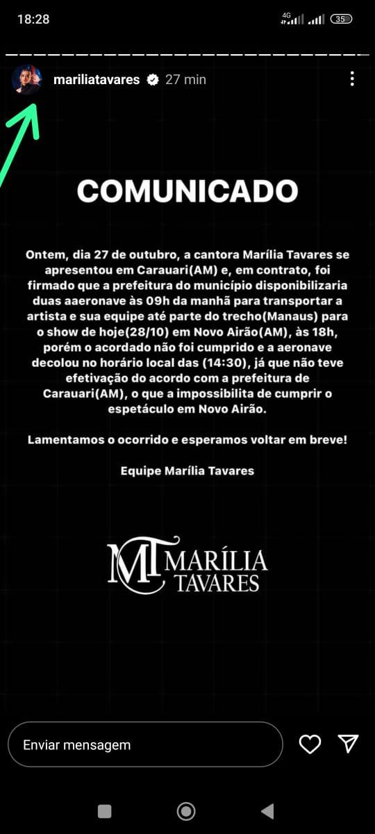 Amazonas – A cantora sertaneja Marília Tavares emitiu um comunicado neste sábado, 28, em suas redes sociais, após ser enganada pela Prefeitura de Carauari, comandada por Bruno Litaiff Ramalho (MDB).