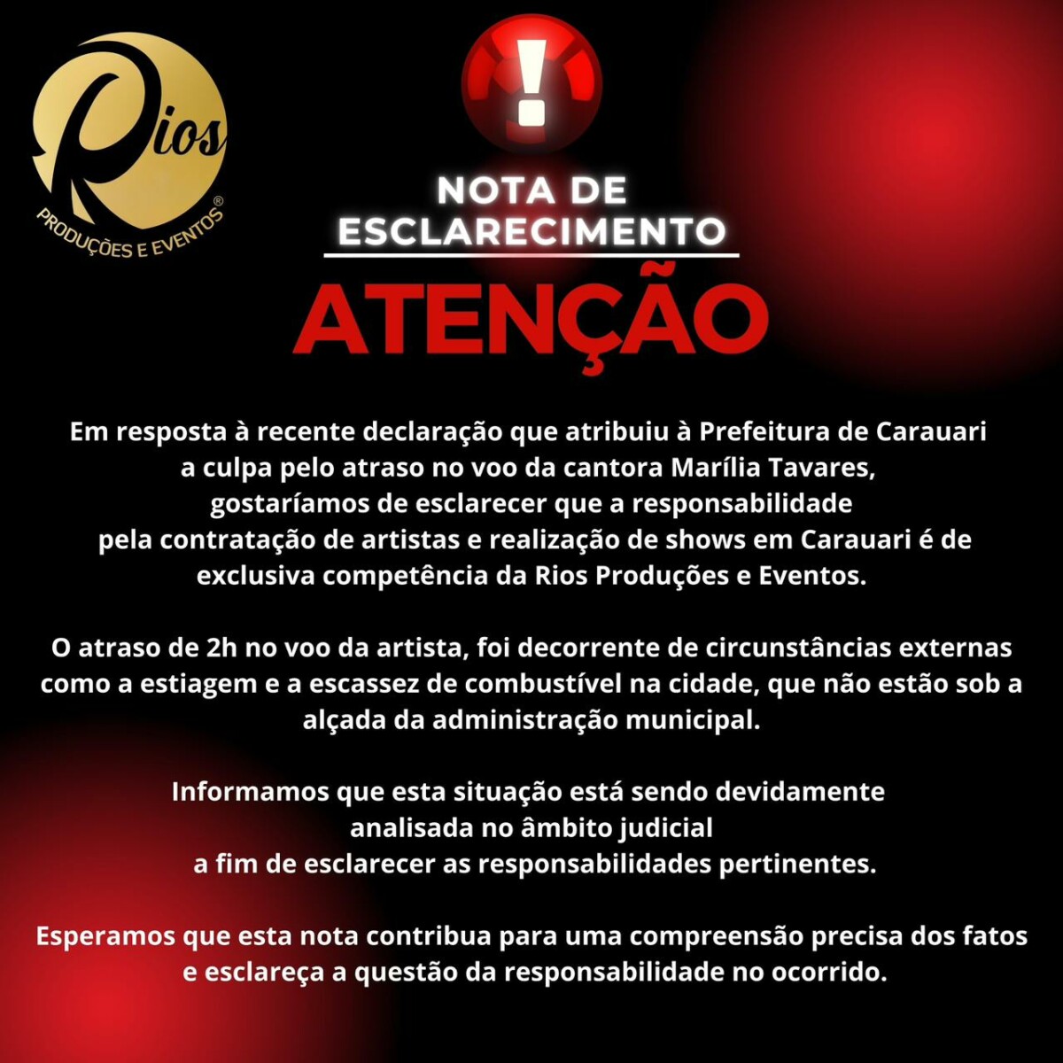 A Prefeitura Municipal de Carauari, esclarece que o translado aéreo da cantora Marília Tavares e toda a sua equipe, é de INTEIRA RESPONSABILIDADE da Empresa RIOS PRODUÇÕES E EVENTOS, contratada pela Prefeitura para gerenciar todo o evento. Sendo assim, a Prefeitura Municipal de Carauari CUMPRIU rigorosamente com o contrato firmado com a referida empresa de eventos, como SEMPRE cumpriu nos eventos anteriores. Informa ainda que esta a disposição para prestar TODAS as informações a respeito do dito contrato e que todos os meios legais estão sendo tomados para averiguar os reais responsáveis.