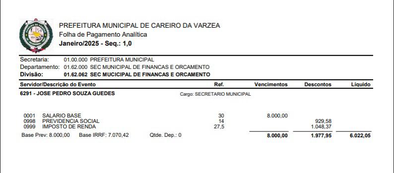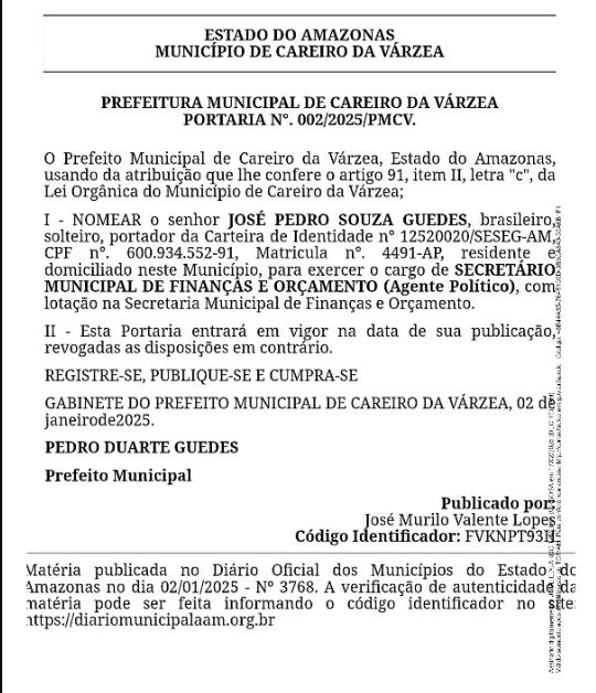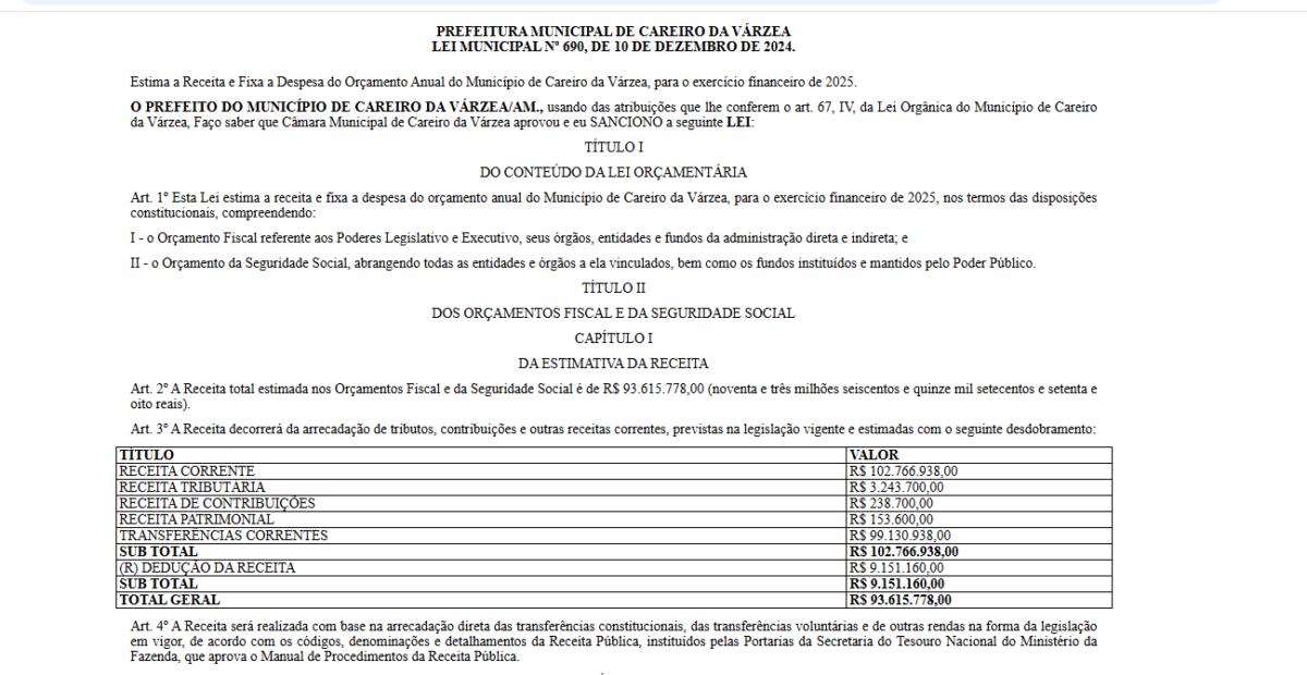 A escolha de José Pedro Souza Guedes para gerenciar as finanças municipais ocorre em um momento de grande movimentação orçamentária no município. Segundo a Lei Municipal nº 690/2024, que estabelece o orçamento de Careiro da Várzea para 2025, a cidade contará com R$ 93,6 milhões, dos quais R$ 65,7 milhões são destinados ao Orçamento Fiscal e R$ 27,8 milhões à Seguridade Social.