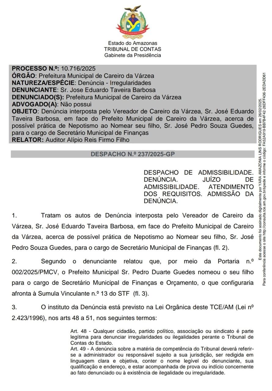 Amazonas – O prefeito de Careiro da Várzea, Pedro Guedes (PSD), está sendo investigado pelo Tribunal de Contas do Estado do Amazonas (TCE-AM) após a nomeação de seu filho, José Pedro Souza Guedes, para o cargo de secretário municipal de Finanças e Orçamento. A decisão gerou controvérsias e resultou em uma denúncia formal questionando a legalidade da medida.