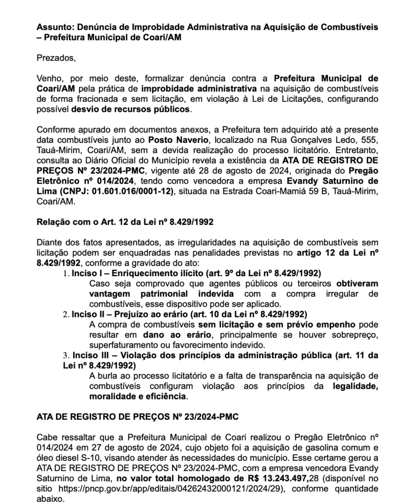 Amazonas – O Portal e TV CM7 Brasil recebeu graves denúncias envolvendo o prefeito de Coari, Adail Pinheiro, acusado de praticar diversas irregularidades administrativas. Segundo as informações encaminhadas, uma das principais acusações é a compra de combustíveis sem licitação, o que, de acordo com as denúncias, pode configurar desvio de recursos públicos, enriquecimento ilícito e improbidade administrativa.