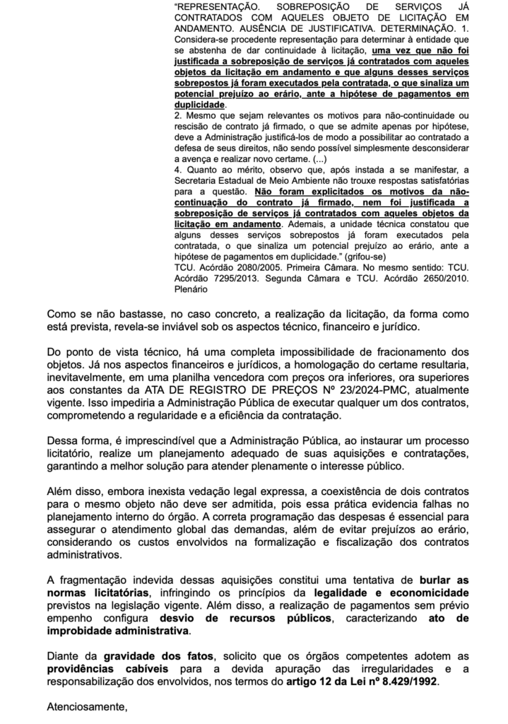 Diversos vídeos foram enviados ao portal mostrando veículos sendo abastecidos em um posto de combustível na cidade, supostamente sem a devida licitação. Essas evidências foram suficientes para que uma denúncia formal fosse apresentada ao Ministério Público e ao Tribunal de Contas da União (TCU), solicitando a apuração detalhada do caso.
