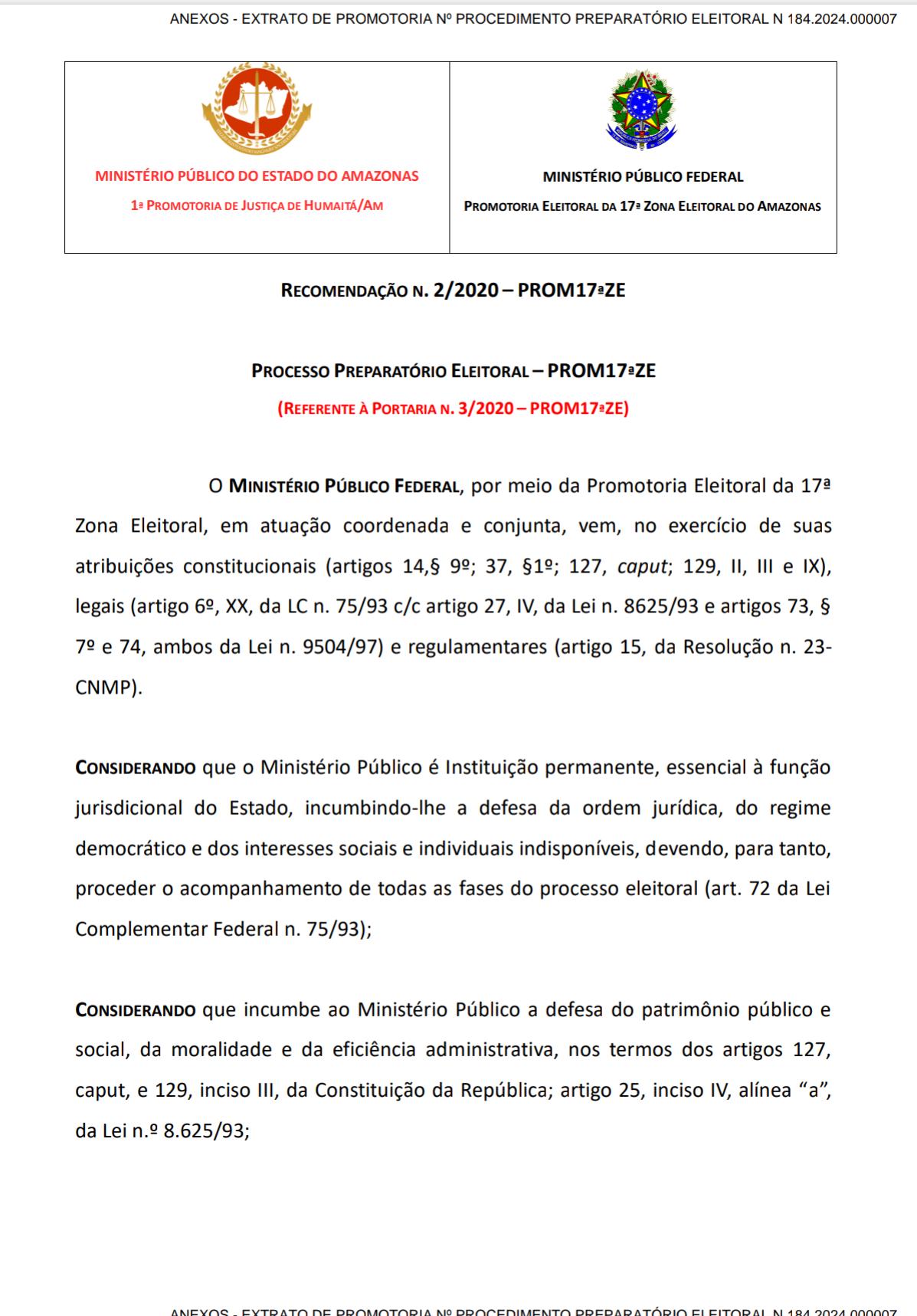 Amazonas – O Ministério Público Federal (MPF) e o Ministério Público do Amazonas (MPAM) emitiram recomendações ao prefeito de Humaitá, Dedei Lobo, e ao presidente da Câmara Municipal, Manoel Domingos dos Santos Neves, alertando sobre a ilegalidade de doações de imóveis em ano eleitoral.