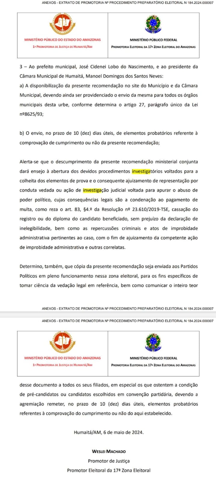 O MPF e o MPAM deram um prazo de dez dias para que as recomendações sejam acatadas, exigindo também a divulgação das mesmas nos sites da Prefeitura e da Câmara Municipal de Humaitá. O não cumprimento das recomendações pode resultar em processos eleitorais e até mesmo na cassação de mandatos.