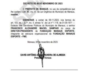 Manaus – O prefeito de Manaus, David Almeida exonerou o diretor presidente da Fundação Manaus Esporte, o pastor da Igreja Universal do Reino de Deus, Francisco Alexandre Maciel Sampaio na manhã desta quinta-feira (9).