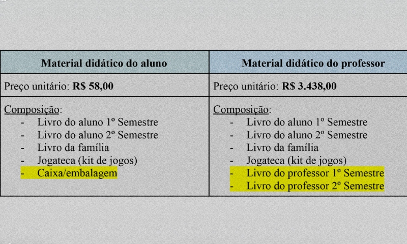 De acordo com o TCE, o superfaturamento anual nos kits dos professores chega a R$ 996 mil, enquanto nas licenças de uso o prejuízo é de R$ 667,2 mil por ano. O relatório critica duramente a falta de razoabilidade nos preços: “Ainda que se trate de uma obra intelectual, é injustificável que dois livros para professores custem R$ 3.380, enquanto o conjunto de materiais para alunos, incluindo livros e jogos, saia por R$ 58”, aponta o documento. O órgão destaca que a diferença não pode ser explicada por economias de escala ou qualquer outro argumento técnico.