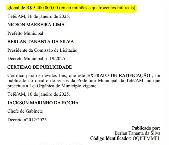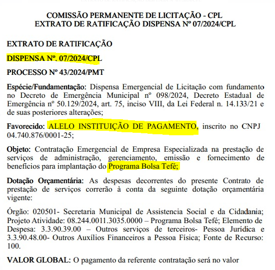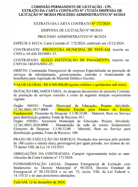 Amazonas – O prefeito de Tefé, Nicson Marreira, firmou um novo contrato com a empresa Alelo no valor de R$ 5,4 milhões. O montante total de recursos destinados à mesma companhia agora é de R$ 9,9 milhões. O novo contrato, assinado em janeiro de 2025, trata da prestação de serviços relacionados ao programa Bolsa Tefé, que visa à implementação de benefícios para os cidadãos do município.