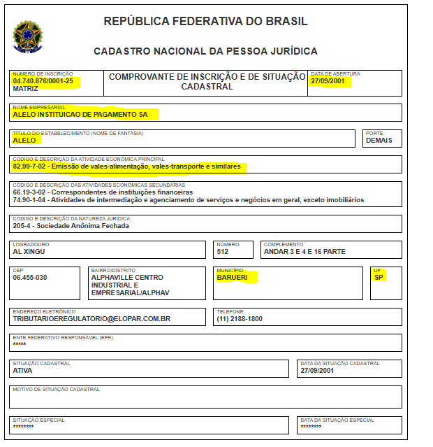 A empresa Alelo, com a razão social ALELO INSTITUICAO DE PAGAMENTO SA, opera com o CNPJ 04.740.876/0001-25 e tem sua sede localizada no Alphaville Centro Industrial e Empresarial em Barueri – SP. Seu foco principal de atuação é de emissão de vales-alimentação, vales-transportes e similares, de acordo com o código CNAE N-8299-7/02.