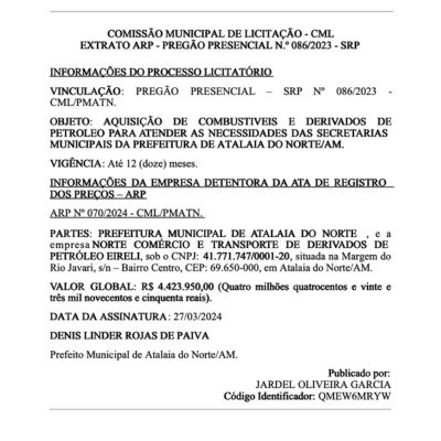 Amazonas – O prefeito de Atalaia do Norte, no interior do Amazonas, Denis Linder Rojas de Paiva, assinou no dia 27 de março deste ano a aquisição de combustíveis e derivados de petróleo para atender as necessidades das secretarias municipais da prefeitura, porém o valor pago pelo insumo chama atenção, cerca de R$ 4.423.950,00, que serão pagos a empresa NORTE COMÉRCIO E TRANSPORTE DE DERIVADOS DE PETRÓLEO EIRELI, com CNPJ 41.771.747/0001-20.
