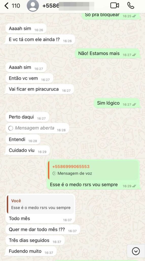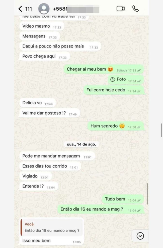 “Ah, sim. Mas você tá com ele ainda”, questiona o prefeito. “Não estamos mais!”, responde a suposta vítima. Em outra troca de mensagens, Douglas Lima fala sobre o corpo da mulher: “Delícia demais você, muito gostosa. E eu também, louco demais pra te ver”, diz o prefeito. Como resposta, a amante fala apenas que o “dinheiro caiu”.