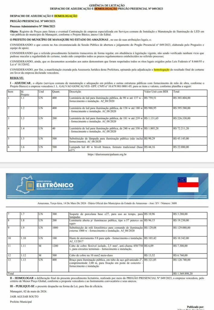 Amazonas – O prefeito Jair Souto (MDB) de Manaquiri, município do Amazonas, está prestes a investir mais de R$ 1,3 milhão na instalação de iluminação pública de LED, após rejeitar o projeto proposto pelo Governo do Estado. O montante, de acordo com o publicado no Diário Oficial dos Municípios (DOM), será destinado à empresa J. L. Galvão – EPP, conhecida também como Galgon Construções e Projetos, sediada em Manaus.
