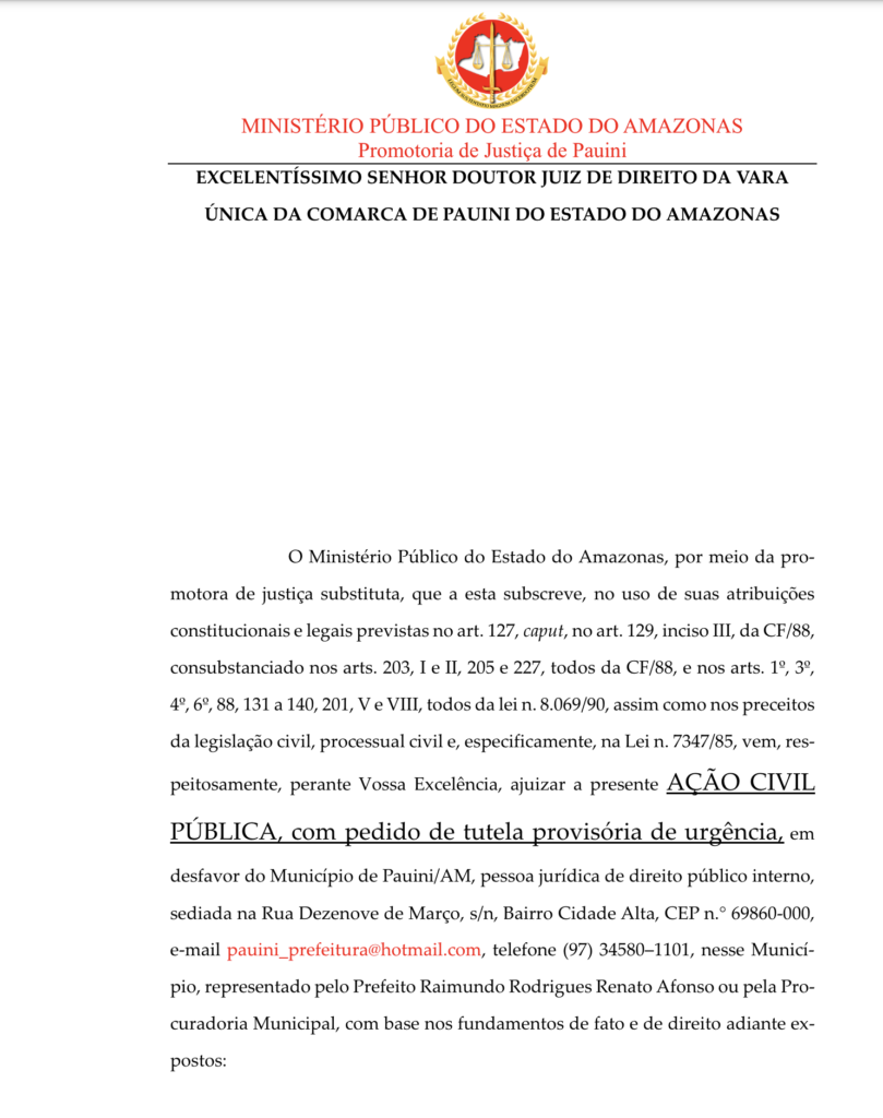 Amazonas – O Ministério Público do Estado do Amazonas, representado pela promotora de justiça substituta Danielly Christini Samartin Gouveia de Andrade, em 2022 moveu uma Ação Civil Pública contra o atual prefeito de Pauini, Renato Afonso.