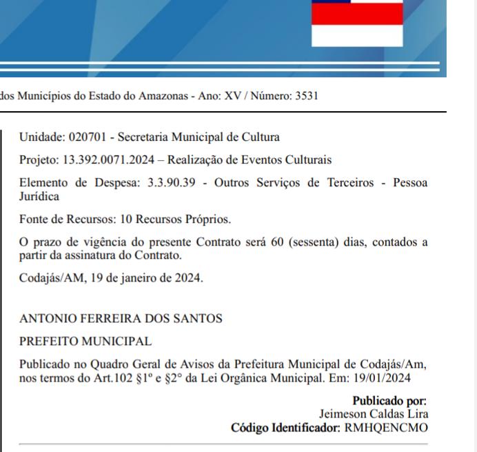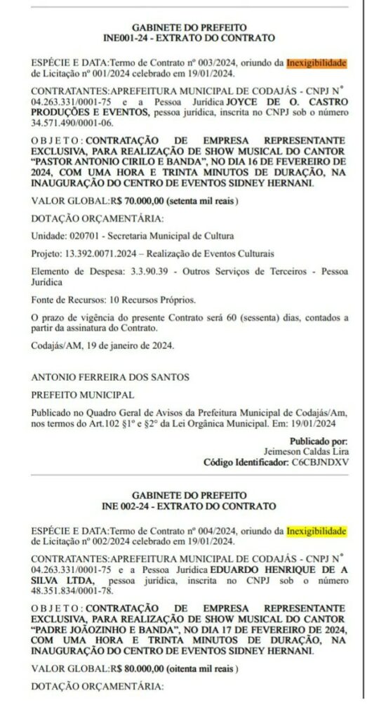 Amazonas – O prefeito de Codajás, Antônio Ferreira, conhecido como Tonho (PP), optou por dispensar licitação para contratar shows religiosos na inauguração do Centro de Eventos Sidney Hernani, no município. Os shows, que envolvem um pastor e um padre, totalizarão uma despesa de R$ 150 mil para os cofres públicos, conforme revelado pelos Extratos publicados na edição desta segunda-feira (22), do diário oficial da Associação Amazonense de Municípios (AAM).