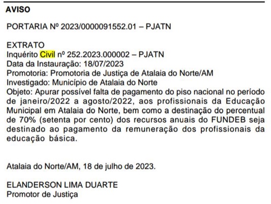 O MPAM abriu o Inquérito Civil nº 252.2023.000002-PJATN por meio da Portaria nº 2023/0000091552.01-PJATN com o objetivo de investigar essas questões. O foco principal da investigação é apurar se houve o não pagamento do piso nacional aos profissionais da Educação Municipal durante o período de janeiro a agosto do ano passado. A falta de pagamento do piso nacional dos professores é uma infração que pode ter sérias implicações legais e consequências para a gestão municipal.