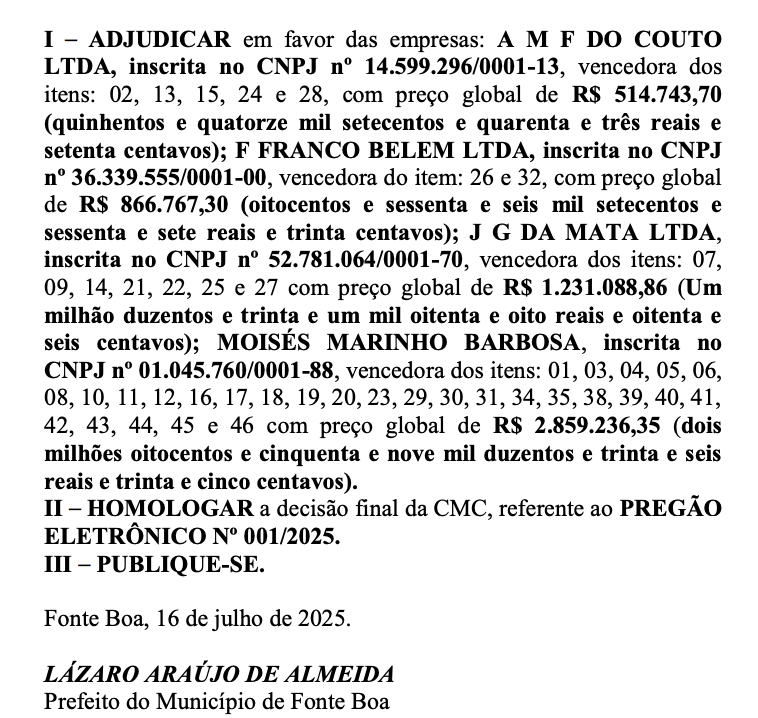 Prefeitura de Fonte Boa destina mais de R$ 5 milhões a empresas de Manaus e Iranduba e gera suspeitas de superfaturamento e privilégios