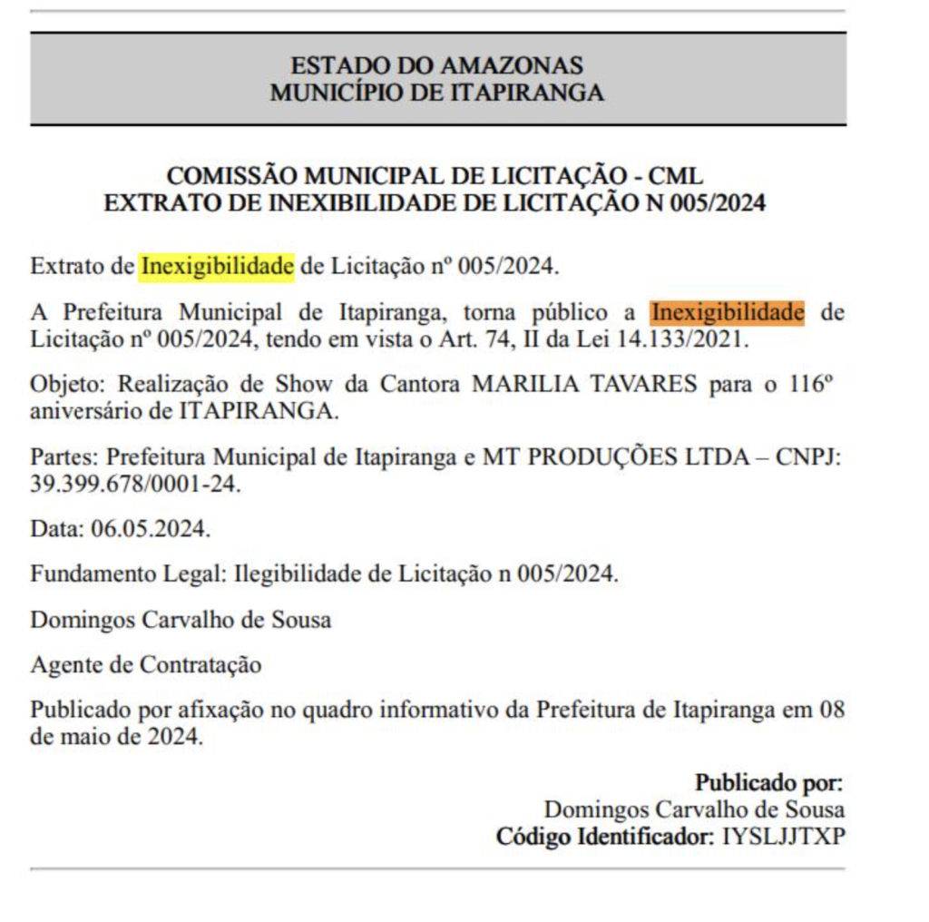 Amazonas – O município de Itapiranga, localizado a 339 quilômetros de Manaus, está envolto em polêmica após omitir o valor do contrato para o show da renomada cantora Marília Tavares, que se apresentará no evento de comemoração do 116º aniversário da cidade. A contratação foi oficializada por meio do Extrato de Inexigibilidade de Licitação nº 005/2024, assinado no dia 8 de maio e publicado no diário oficial da Associação Amazonense de Municípios (AAM).