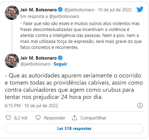 Presidente Bolsonaro se manifesta sobre ataque contra tesoureiro do PT: “Dispensamos apoio de quem pratica violência”