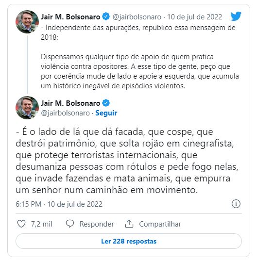 “É o lado de lá que dá facada, que cospe, que destrói patrimônio, que solta rojão em cinegrafista, que protege terroristas internacionais, que desumaniza pessoas com rótulos e pede fogo nelas, que invade fazendas e mata animais, que empurra um senhor num caminhão em movimento”, disse o presidente, reiterando que a direita é civilizada e de bem.