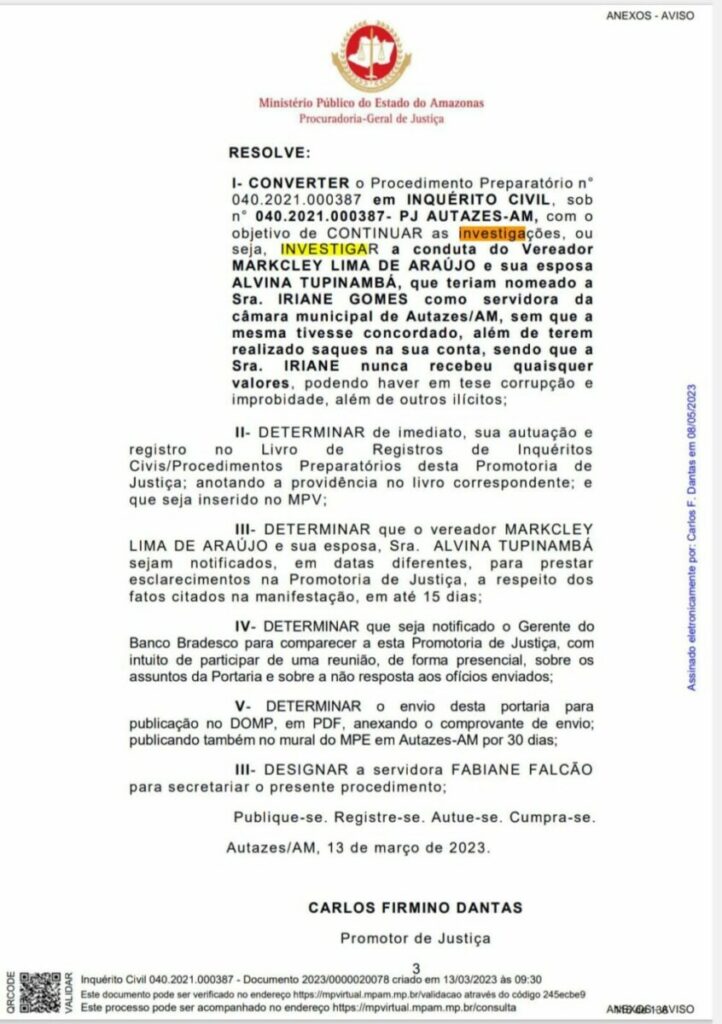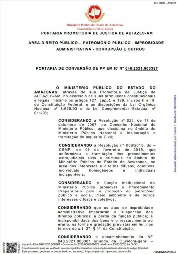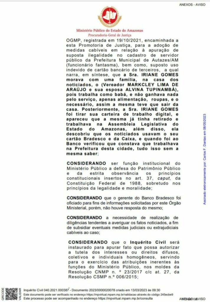 Amazonas – O Ministério Público do Estado do Amazonas (MPAM) abriu um Inquérito Civil para investigar um caso de possível improbidade administrativa envolvendo o presidente da Câmara Municipal de Autazes (CMA), o vereador Marcley Lima de Araújo (PSC), e sua esposa Alvina Tupinambá. A investigação foi iniciada após denúncias de nomeação irregular de uma servidora e saques suspeitos em sua conta bancária.