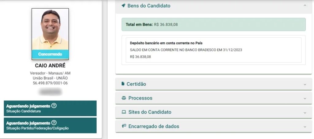 Manaus – A mais recente declaração de bens do presidente da Câmara Municipal de Manaus (CMM), Caio André, tem gerado polêmica e questionamentos sobre a transparência e a evolução patrimonial do parlamentar. De acordo com os dados disponíveis na plataforma de Divulgação de Candidaturas e Contas Eleitorais do Tribunal Superior Eleitoral (TSE), Caio André registrou um patrimônio de apenas R$ 36.838,08, correspondente ao saldo em uma conta bancária. Intrigantemente, o vereador declarou não possuir imóveis ou veículos em seu nome.