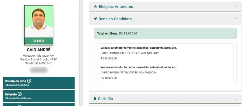A incompatibilidade é ainda mais notável quando revisamos a declaração de bens de Caio André do ano de 2020, quando foi eleito vereador. Naquela eleição, o político declarou um patrimônio de R$ 82 mil, incluindo dois veículos avaliados em R$ 50 mil e R$ 32 mil. Desde então, a aparente diminuição de seus bens é preocupante e sugere uma evolução patrimonial negativa, que parece inconsistente com o crescimento profissional e a ascensão política do vereador.