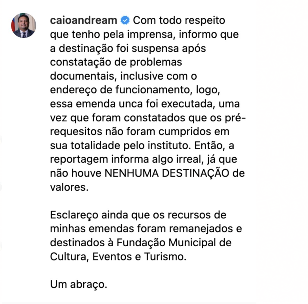 Após a polêmica, Caio André se manifestou e afirmou publicamente que não chegou a destinar a referida verba, uma vez que “os pré-requisitos não foram cumpridos pelo instituto”.