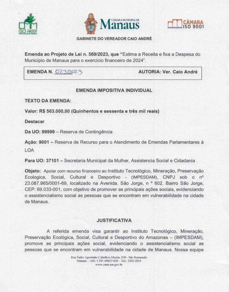 Manaus – No cenário político manauara, uma polêmica tem agitado os bastidores após o presidente da Câmara Municipal de Manaus, Caio André, reservar uma quantia significativa para um instituto que, ao que tudo indica, não corresponde à sua finalidade declarada. O Instituto Tecnológico, Mineração Preservação Ecológica, Social Cultural e Desportivo (IMPESDAM) iria receber o valor de 563 mil reais de recurso público das mãos do vereador. No entanto, ao ter suas finalidades investigadas, teve o valor suspenso.