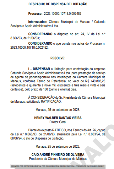 Manaus – O presidente da Câmara Municipal de Manaus (CMM), Caio André, decidiu mais uma vez dispensar uma licitação para realizar a contratação de serviços de portaria/porteiro nas dependências da Casa Legislativa. Conforme publicação no Diário Oficial da CMM desta segunda-feira (25), a empresa Catunda Serviços e Apoio Administrativo Ltda foi escolhida para realizar o serviço, pelo valor de R$ 749.803,26, com uma vigência de contrato de 180 dias.