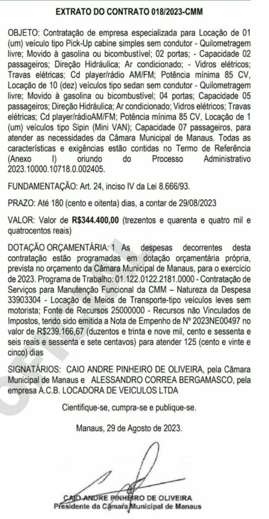 Este não é o primeiro caso em que o presidente da Câmara de Manaus dispensa licitação para contratação de empresas. Recentemente, um contrato no valor de R$ 334.400,00 foi firmado com a empresa A.C.B Locadora de Veículos Ltda para a locação de veículos, incluindo uma pick-up, dez veículos tipo sedan e um veículo tipo mini van. A vigência desse contrato também é de 180 dias, a partir de 29 de agosto.