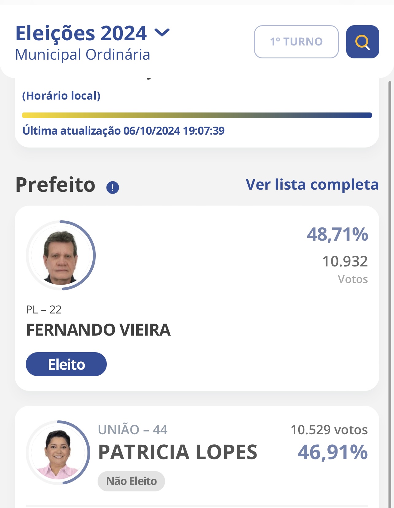 Amazonas – Com 100% das urnas apuradas, Fernando Vieira foi escolhido como o novo prefeito de Presidente Figueiredo, obtendo 48,71% dos votos, o que representa 10.932 votos. O candidato do PL – 22 venceu a atual prefeita, Patrícia Lopes, que buscava a reeleição.