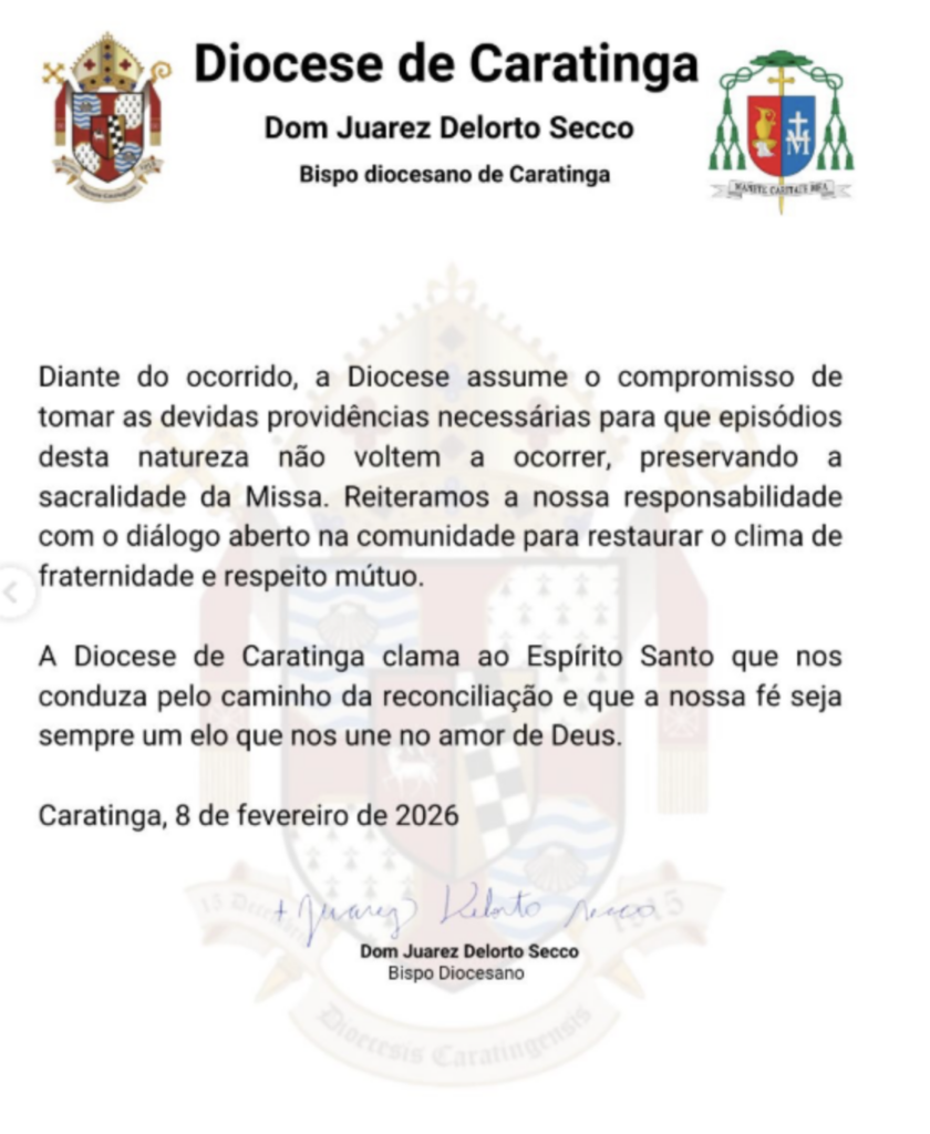 Brasil – A Diocese de Caratinga, em Minas Gerais, divulgou nota oficial neste sábado (8) informando que o padre Flávio Ferreira Alves pediu perdão após ter negado a Comunhão a fiéis que declarassem apoio ao deputado federal Nikolas Ferreira (PL-MG) durante missa celebrada na Capela São Sebastião, em Pingo D’Água.