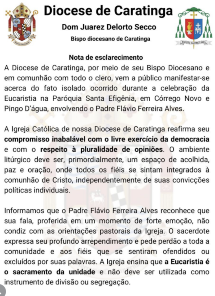 Você não merece receber a eucaristia.”A declaração gerou forte repercussão e críticas de setores conservadores, que enxergaram politização do altar e discriminação religiosa por motivação política.Em nota assinada pela diocese, o padre Flávio reconheceu que a fala foi proferida “em momento de forte emoção” e que não reflete as orientações pastorais da Igreja Católica. O texto destaca que o sacerdote “expressa seu profundo arrependimento” e pede perdão “a toda a comunidade e aos fiéis que se sentiram ofendidos ou excluídos por suas palavras”.