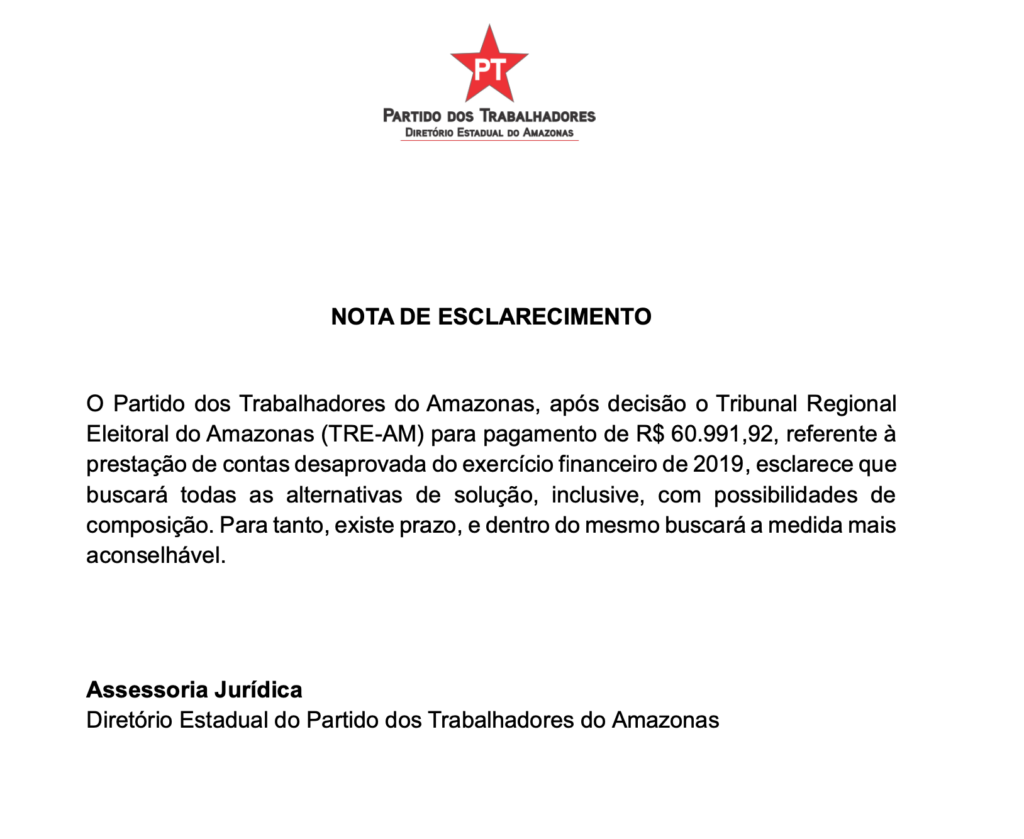 Na nota, assinada pela assessoria jurídica do partido, o PT-AM afirmou que está comprometido em buscar “todas as alternativas de solução” para cumprir a decisão judicial. Entre as possibilidades mencionadas, está a tentativa de composição com o tribunal. O partido destacou que há um prazo estipulado para a regularização da situação e que, dentro desse período, adotará a medida mais adequada para resolver o impasse.