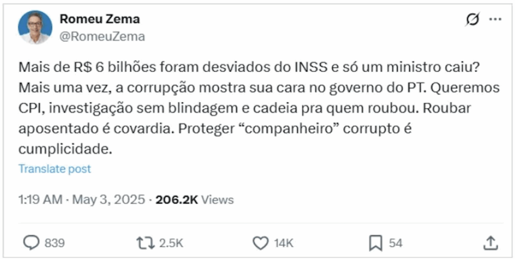 Brasil – O Partido dos Trabalhadores (PT) entrou com uma ação por danos morais contra o governador de Minas Gerais, Romeu Zema (Novo), nesta sexta-feira, 9 de maio de 2025, devido a postagens nas redes sociais que acusam o partido de envolvimento em fraudes no Instituto Nacional do Seguro Social (INSS). As declarações de Zema, publicadas em seus perfis no Instagram e no X, incluem a frase polêmica “o PT roubou os aposentados”, em referência a descontos irregulares detectados em benefícios previdenciários. O PT solicita a retirada imediata das postagens e uma indenização de R$ 30.000, classificando as falas como “falsas, ofensivas, desinformativas e caluniosas”.
