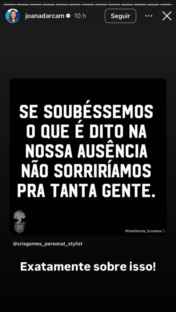 O governo não explicou os motivos da saída. Horas depois da exoneração, Joana publicou uma mensagem enigmática no Instagram: “Se soubéssemos o que é dito na nossa ausência, não sorriríamos para tanta gente.”
