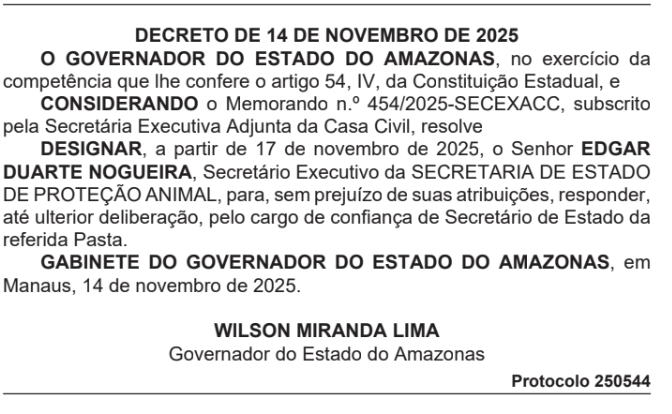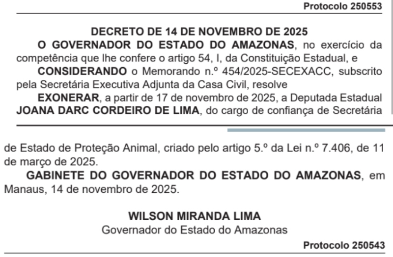 Amazonas – A relação próxima entre o governador Wilson Lima (União Brasil) e a deputada estadual licenciada Joana Darc (União Brasil) ganhou um capítulo inesperado nesta segunda-feira, 17 de novembro, com a exoneração da parlamentar do comando da Secretaria de Proteção Animal do Amazonas (Sepet). O decreto, publicado no Diário Oficial, pegou de surpresa integrantes do próprio governo e foi interpretado por aliados como uma “puxada de tapete” em uma das figuras mais fiéis ao governador dentro do partido.