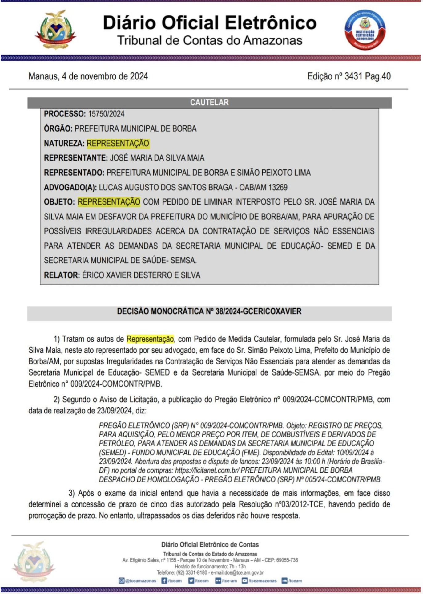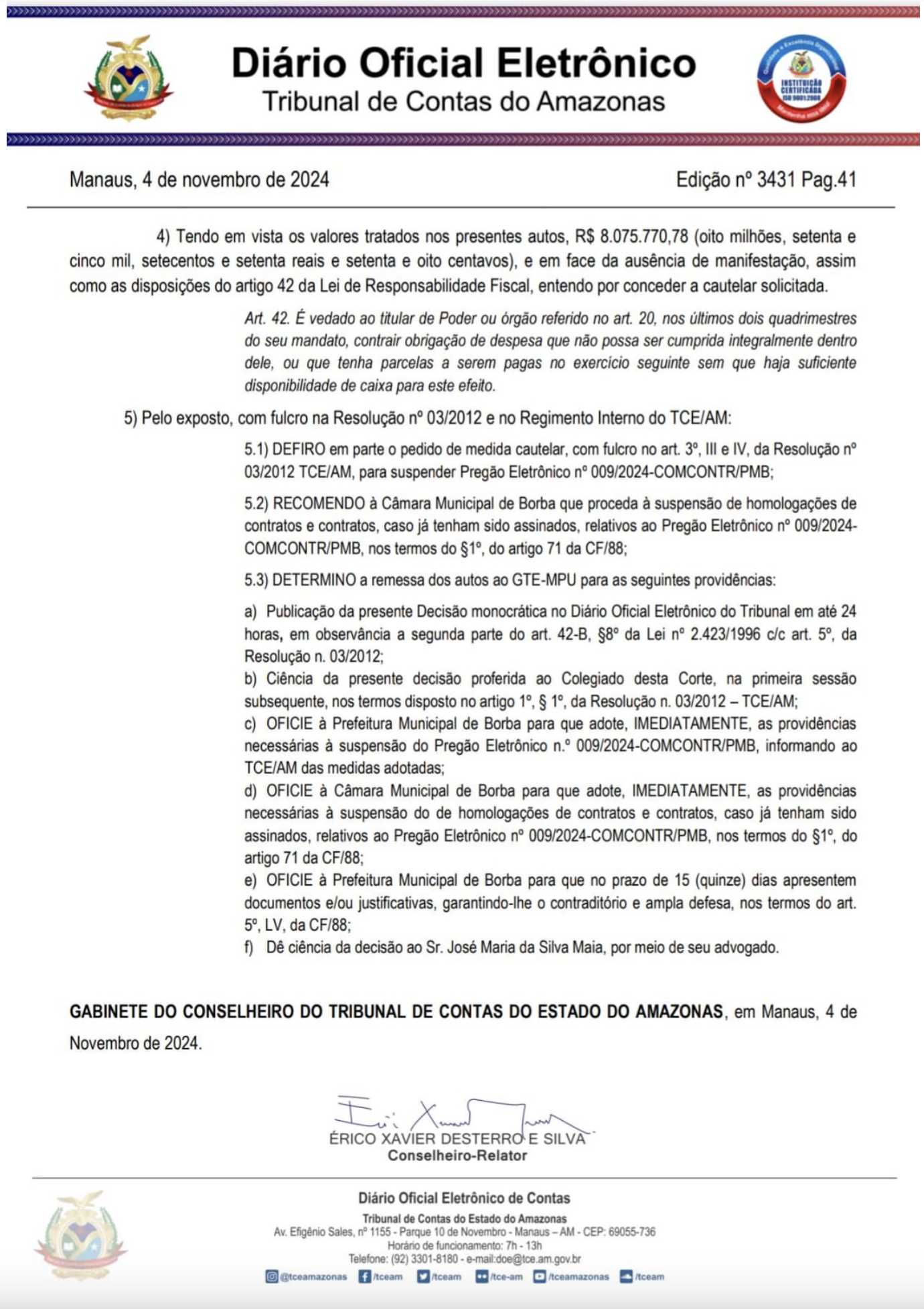 Diante dos fatos, o TCE-AM determinou que a Câmara Municipal de Borba suspenda as homologações dos contratos. O processo está sob relatoria do conselheiro Érico Desterro, que conduzirá a investigação para avaliar possíveis infrações e as responsabilidades da administração municipal.